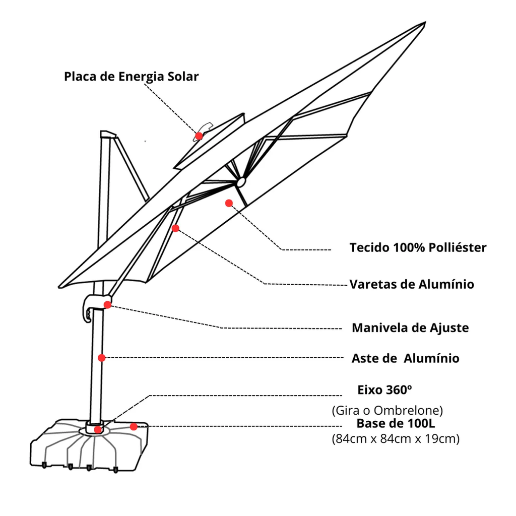 A base está incluída no produto? Sim, o ombrelone acompanha uma base de 100L para garantir maior estabilidade, incluso rodinha para auxiliar na locomoção.